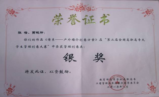 荣获中国发明协会、中国知识产权研究会、中国高等职业技术教育研究会颁发的“第五届全国高职高专‘发明杯’老员工创新创业大赛”管理类创意类专业组铜奖;同时荣获教育部高等公司高职高专工商管理类专业教学指导委员会办法的“第二届全国高职高专老员工管理创意大赛”管理创意类银奖。